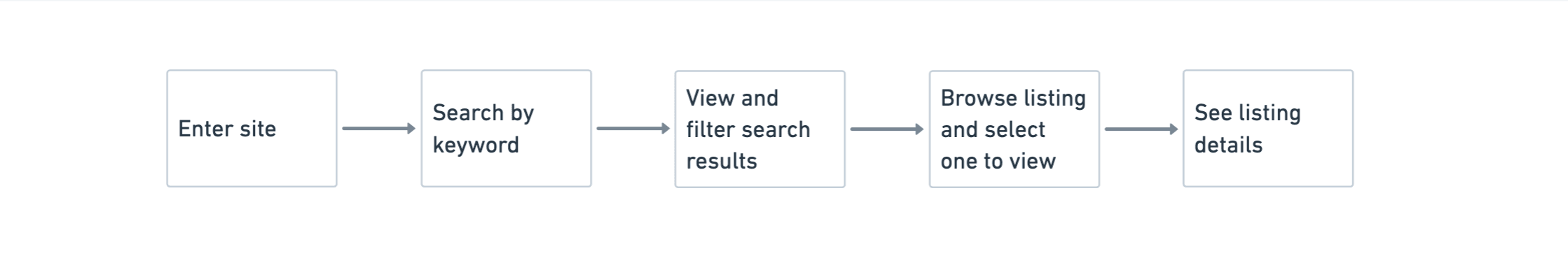 The search journey defines how users search and find product listings in your marketplace. Starting on the landing page, users progressively narrow their search to find the service, rental, or product they need. Users might find what they need by searching nearby locations or via keywords. Results should be filtered by relevant criteria, like price or category.