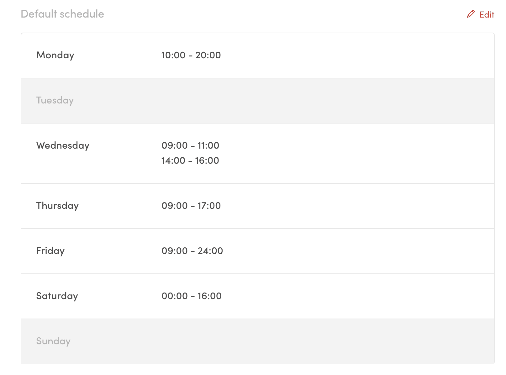 In the EditListingWizard you can save and edit the listing's default schedule. Each day can have several entries which mark bookable periods of time. So, you can add holes to your business hours with entries like 09 - 12 and 14 - 18. You can also have days when the listing is not available. If you want to enable bookings over the night you can set the end time to 24.00 and start availability of the next day from 00:00.