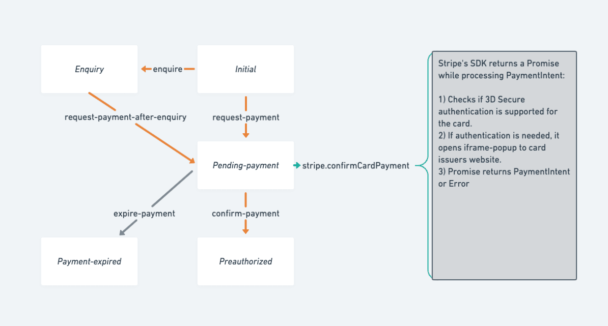 However, to be able to call confirmCardPayment, there needs to be a new state to the transaction process. Because of this, we have split the previous transition (Initial - request -> Preauthorized) into two: