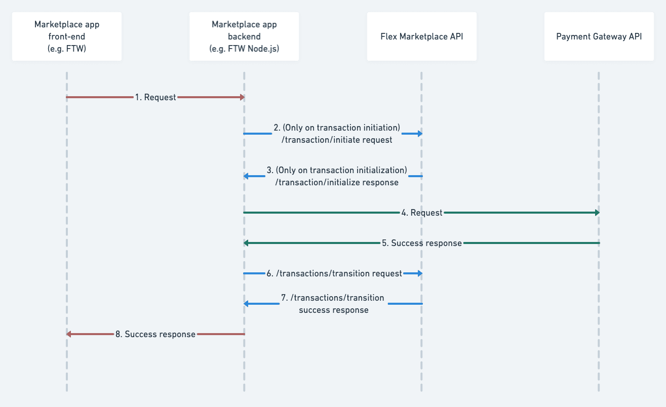 The following diagram shows the call sequence between the marketplace and the APIs. First, a user makes a transaction request using the marketplace front end, after which the backend calls the Flex Marketplace API to initiate the transaction. Next, the marketplace backend calls the payment gateway's API, and finally the Flex Marketplace API is called again after the payment action is completed.