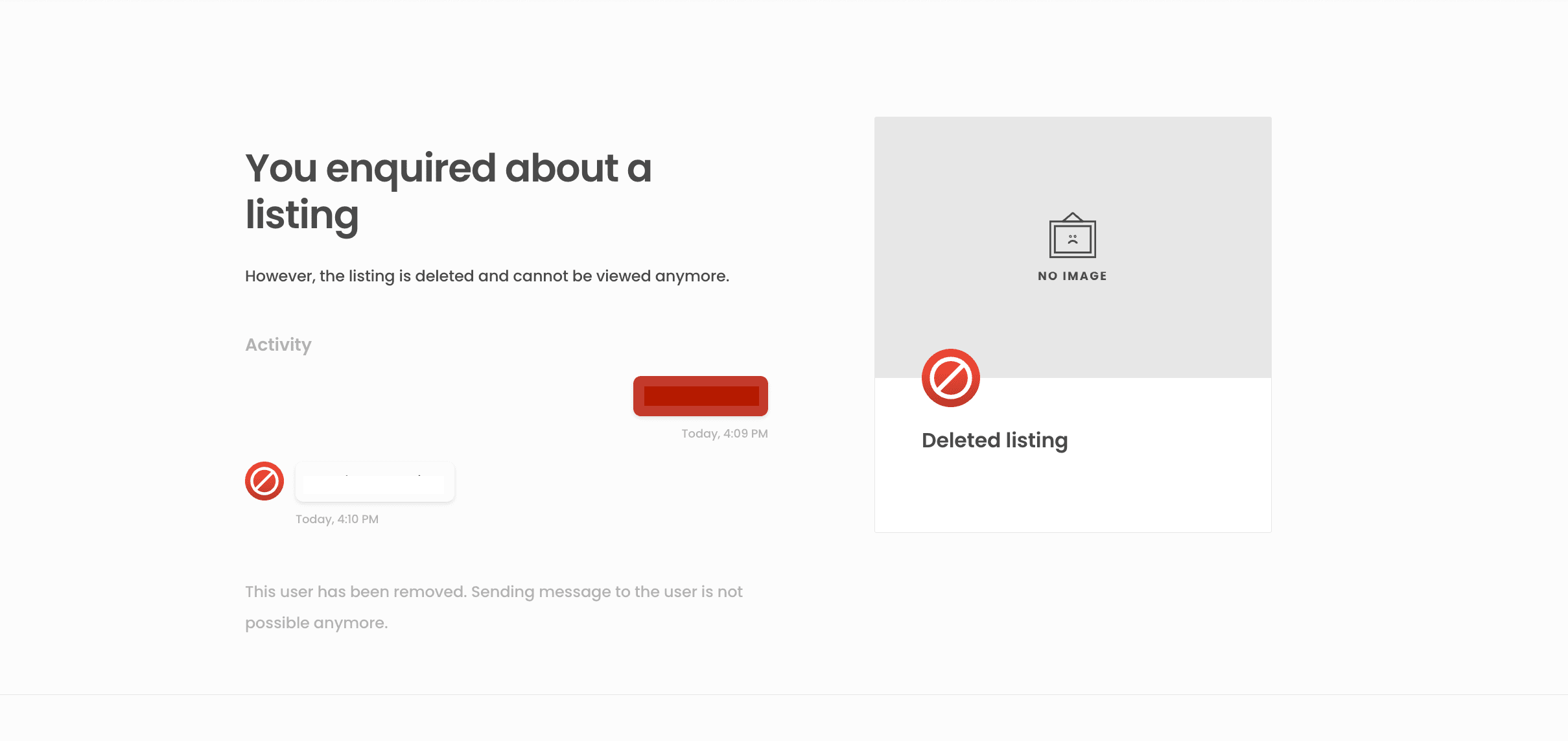 Once a user has been deleted, their listings are also removed. However, their transactions and messages will still show up in the inbox of the transaction's other party.