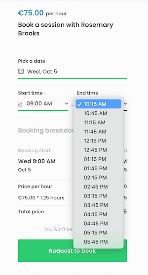 When the booking length is not a factor of a full hour, using the timeslotMinutes value might cause issues, because the start time slot gets rounded to a multiple of the time slot in general. This means that depending on the start time of the availability (8 AM vs 9 AM vs 10 AM), the first time slot may show up as starting 15 minutes or half hour past the actual desired start time.