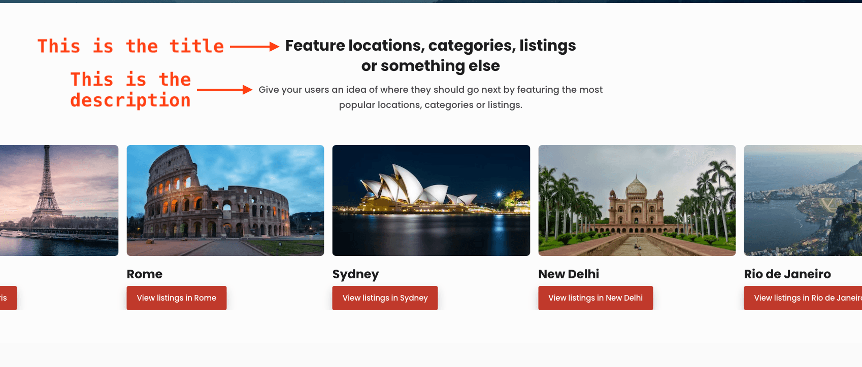 You can add the title and description you want your users to see. The title will be displayed in bigger font at the top of the Section. How big is determined by your title header level. H1 is bigger than H2. The title size also determines the HTML level header indexed by search engines. You can use the title to explain the content of the Section or define a larger text that you want to highlight.